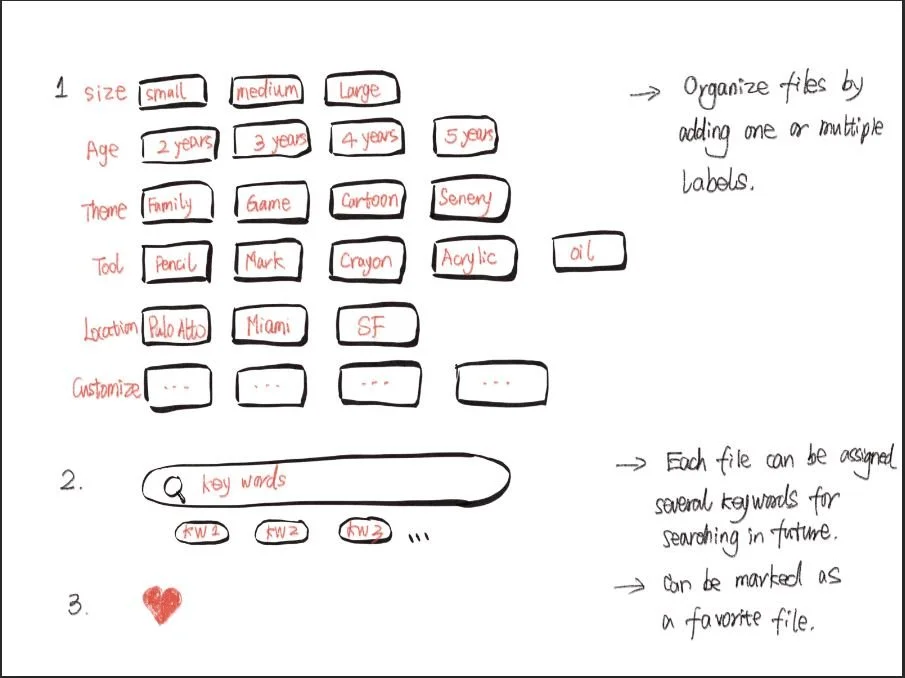 I created a persona, Alice, she is 33 years old, mother of two kids. Even though she is very busy, she is still willing to take the time to preserve and organize her children's artwork. This personas clearly identified the goals that need to be met and the problems that need to be solved.