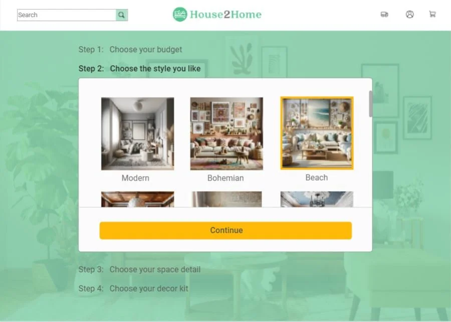 I ultimately chose the second user flow because, compared to uploading inspiration photos, the step by step flow is easier to complete for users on a computer. Additionally, this flow allows users to get more customized décor solutions by selecting their budget and specific characteristics of their living space.