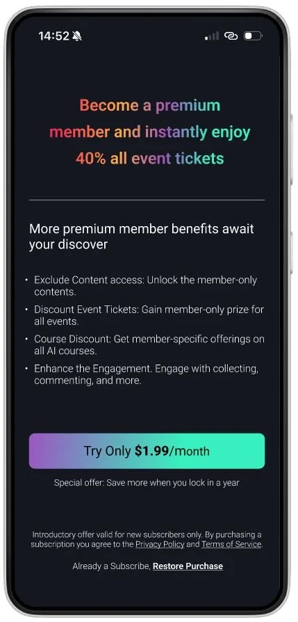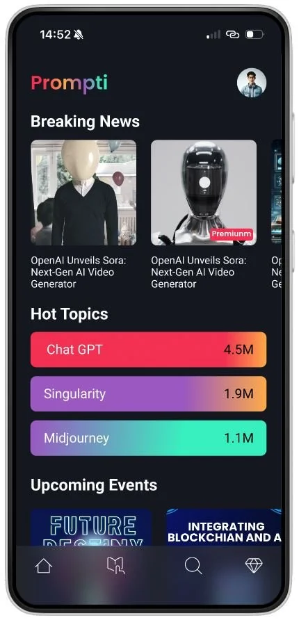 Within this framework, I envision the evolution of the Prompti app. Serving as a comprehensive hub, it aggregates the latest AI news, premium courses, insightful articles, and vibrant discussions sourced from professionals and enthusiasts alike. Furthermore, it offers a curated summary of online and offline events, enriching the user experience. As it transition towards a premium model, Prompti is poised to elevate its offerings, delivering unparalleled value to its community while seamlessly guiding users towards subscription conversion, thereby unlocking new avenues for growth and monetization.