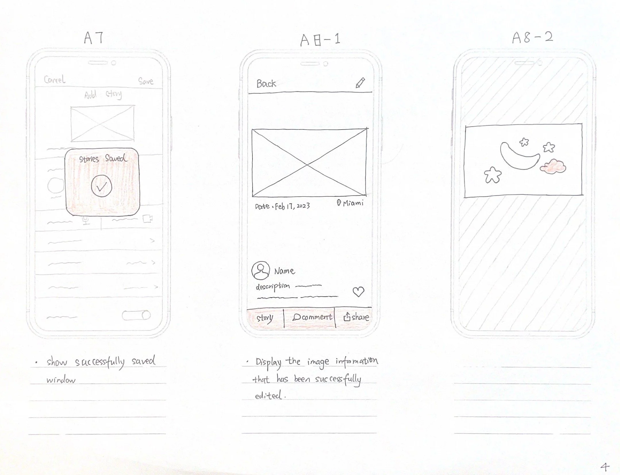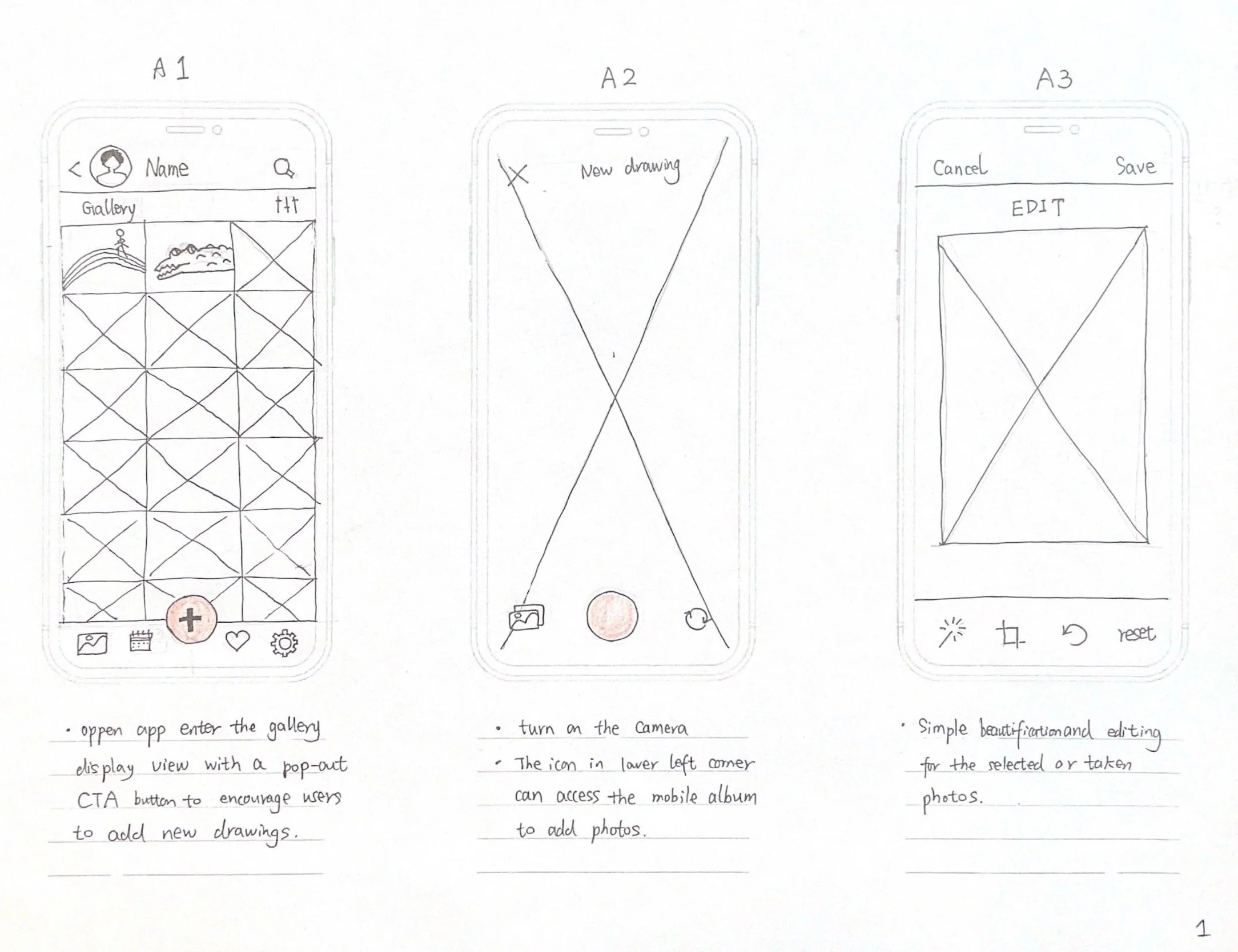 Sketching is a very efficient way to make my ideas tangible so that they can be tested and adjusted before I make higher fidelity versions ,such as through wireframing and prototyping. Sketching allows me to try out a multitude of ideas and iterate them before settling on one. Based on the two red route user flow I drawed, I drew a series sketch of the screens for the Drawing Journey app.