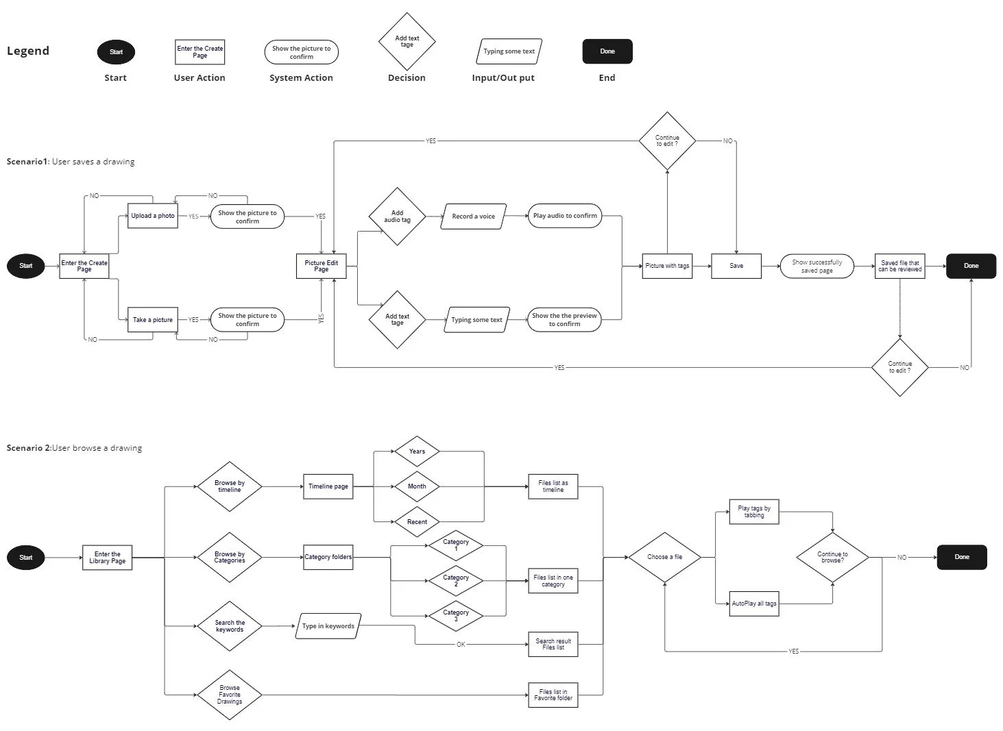 I identified two critical red routes that are related to the core of the Drawing Journey app. One is adding a new drawing or artwork photo along with attaching a child's narration video or audio. The second route is searching for past drawings and their associated stories. I created user flows for both red routes.