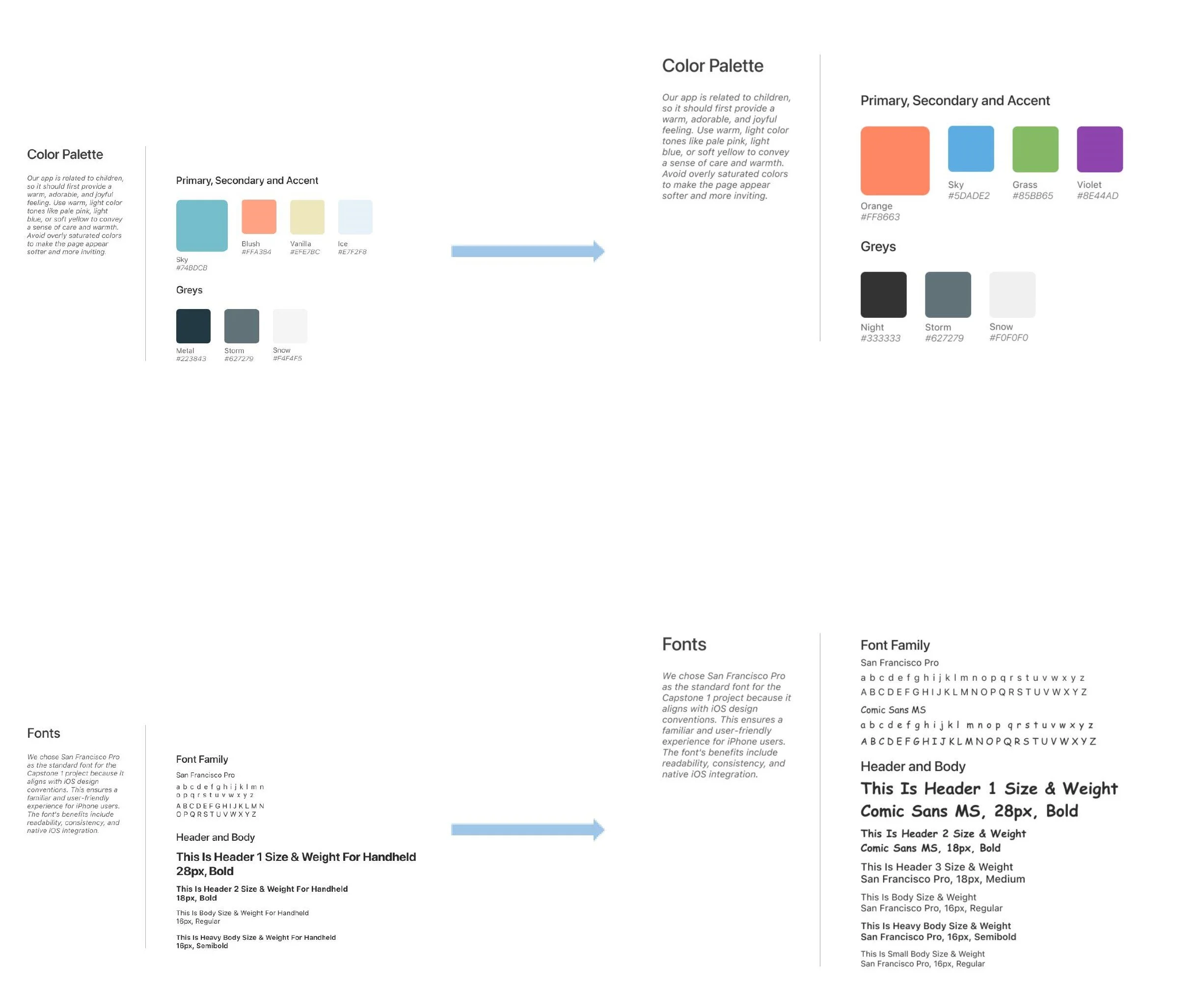 I have bestowed a brand personality upon this app: The app is envisioned as a reliable and creative memory keeper, dedicated to preserving cherished moments and showcasing children's artistic journey through a seamless blend of creativity and technology. I have defined several brand attributes, including Caring, Organized, Trustworthy, Connected, and Amusing. Based on these, I have established the Style Guide for the Drawing Journey app.